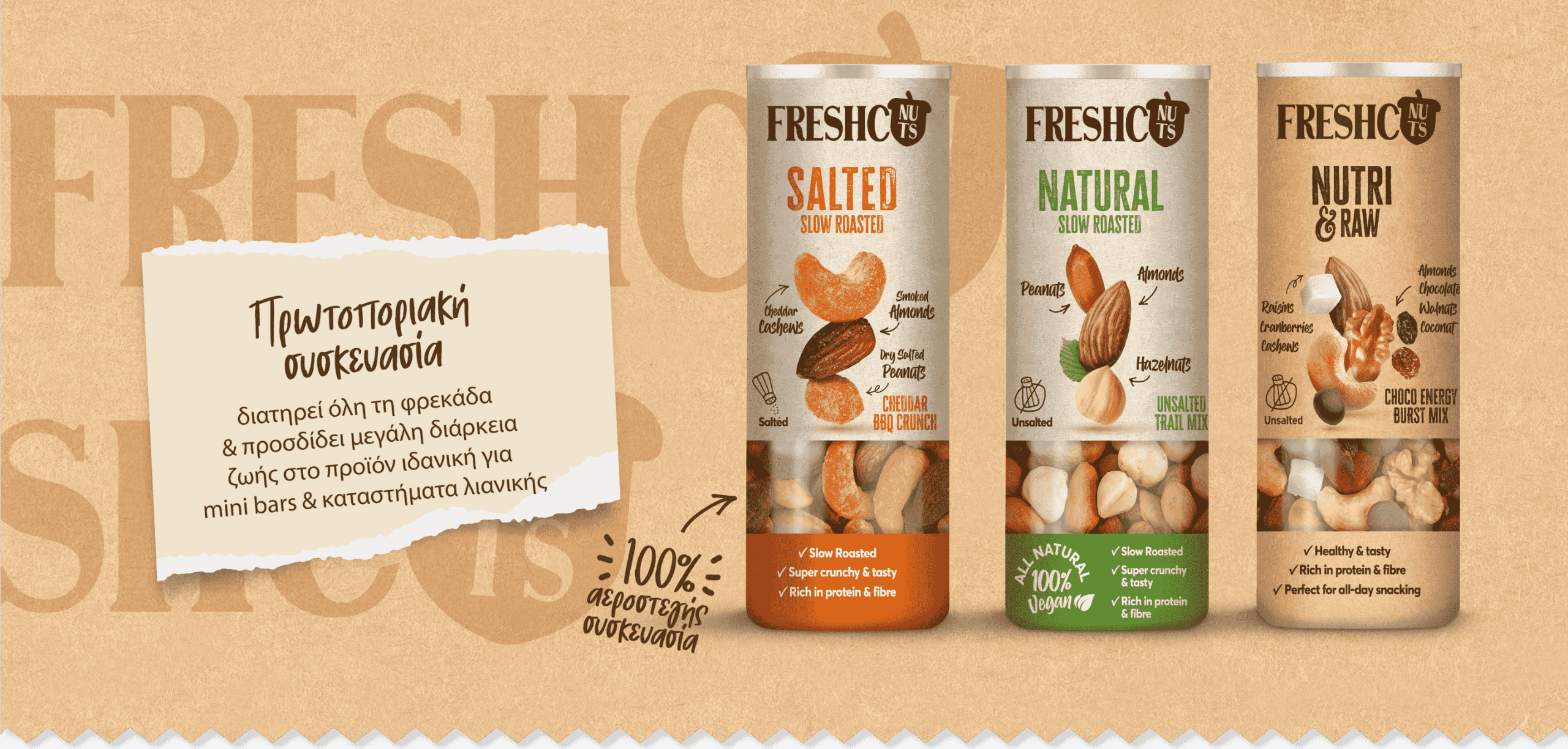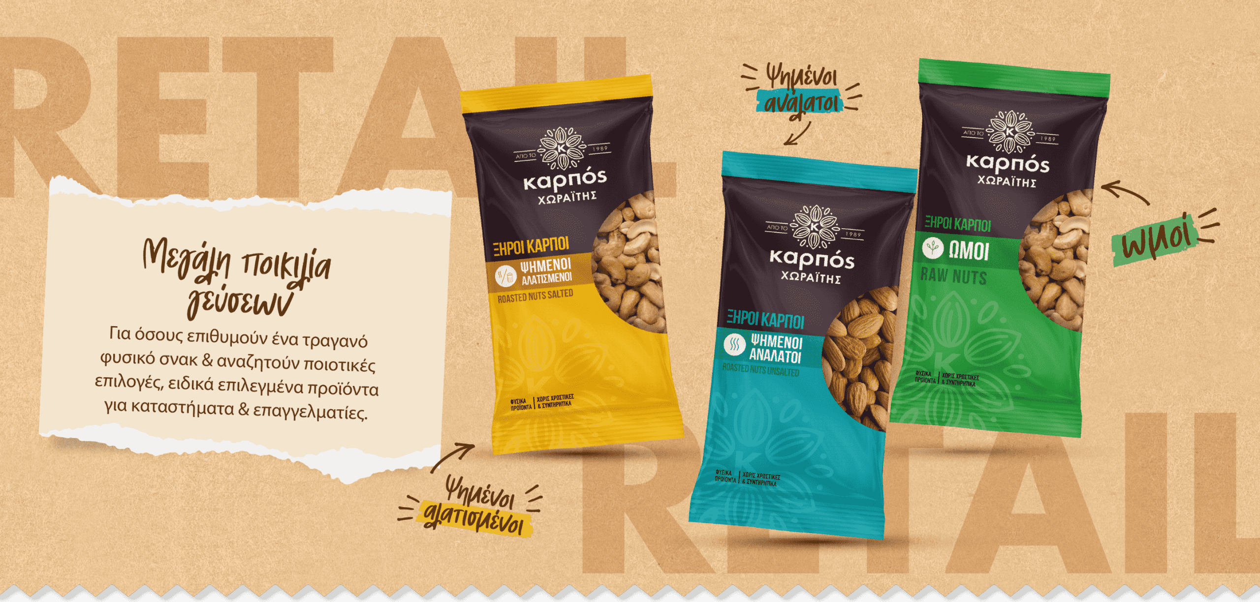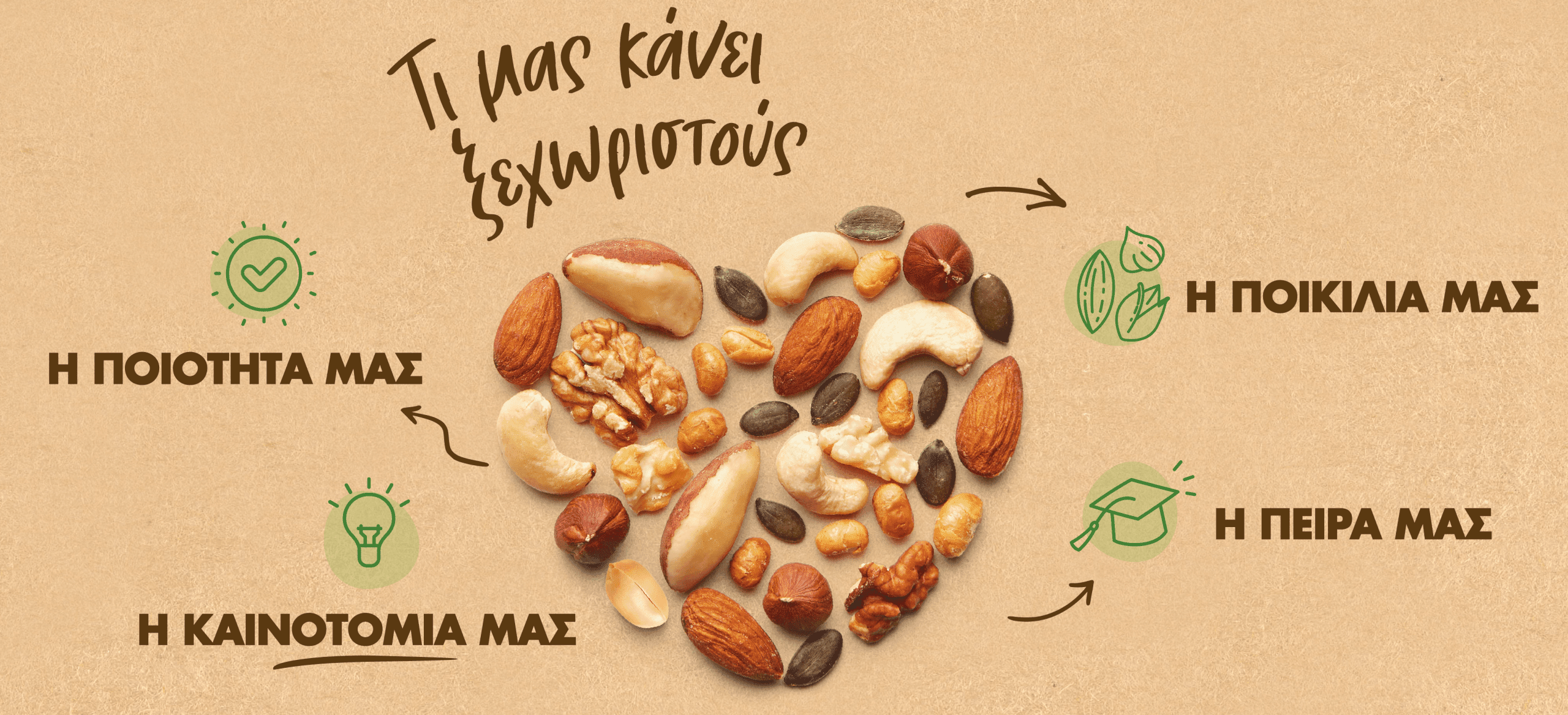 Σεβόμενοι την κουλτούρα και την παράδοση του ξηρού καρπού ως βασικό συστατικό της Μεσογειακής διατροφής και ιστορίας, και με έμπνευση από τις τάσεις και τις ανάγκες του σύγχρονου καταναλωτή, εξελισσόμαστε και καινοτομούμε προσφέροντας αμείωτης ποιότητας προϊόντα, με ακαταμάχητη γεύση και θρεπτική αξία.
